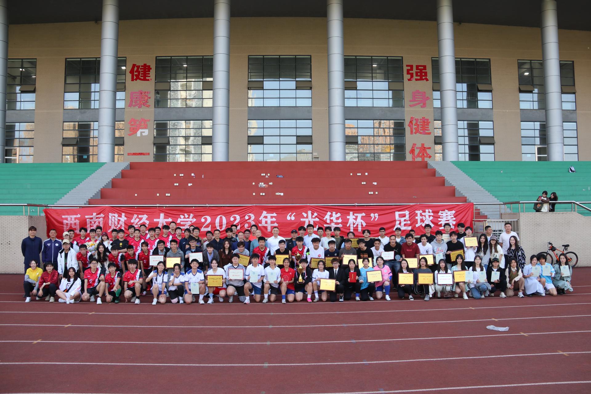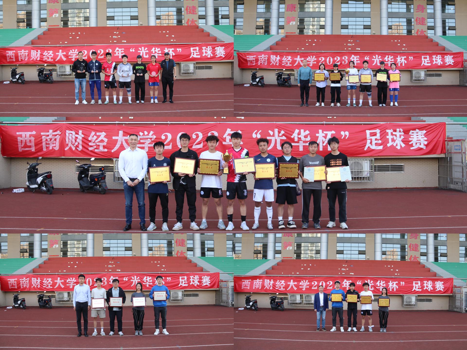 4月25日下午“礼赞新时代·奋进新征程,迎大运·迎百年校庆”2023年西南财经大学“光华杯”足球比赛颁奖仪式在晨曦足球场举行。多宝在线登录院长杨远波,学院党委书记周正宏,副院长阴涛、陈丛刊,副书记李治为获奖学院以及个人颁发了荣誉证书及奖牌。