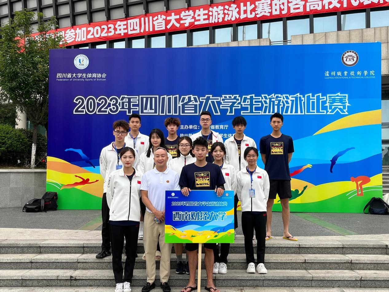 在2023年四川省大学生游泳比赛中,由刘子豪、陈珂欣老师带领的校游泳队取得4金4银2铜的好成绩,并打破男子丙组100米仰泳、200米混合泳两项赛会记录。