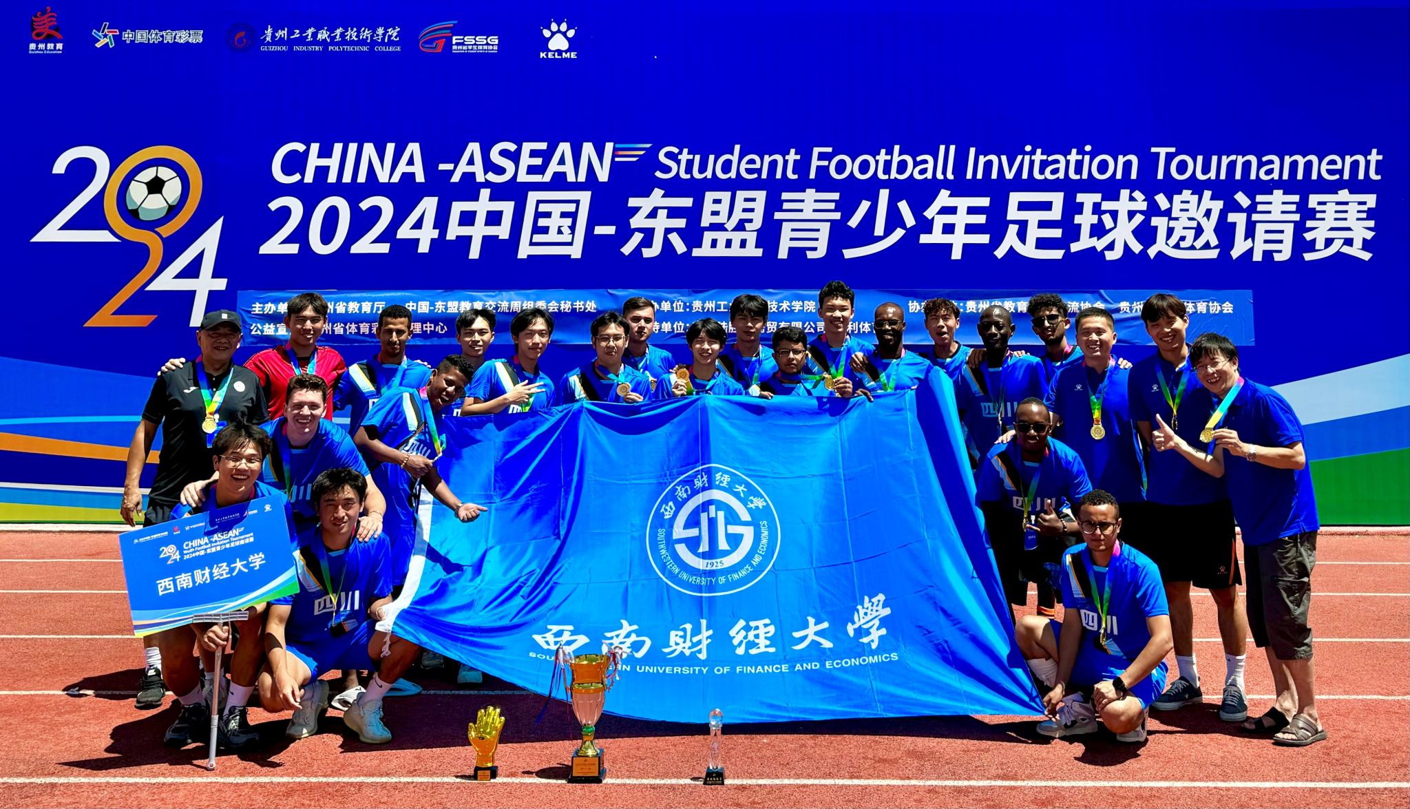 在为期4天的赛程中,来自中国-东盟国家70余名青少年足球精英们共同上演了一场体育盛会。经过激烈角逐,学校男子足球队三战三捷荣获冠军,学生朱峰岩获“最佳守门员”奖,教师简家俊获“最佳教练员”奖。本届比赛,足球队全体队员奋力拼搏,众志成城,不负众望摘得桂冠,充分展示了西财学子的良好精神风貌和蓬勃青春风采。