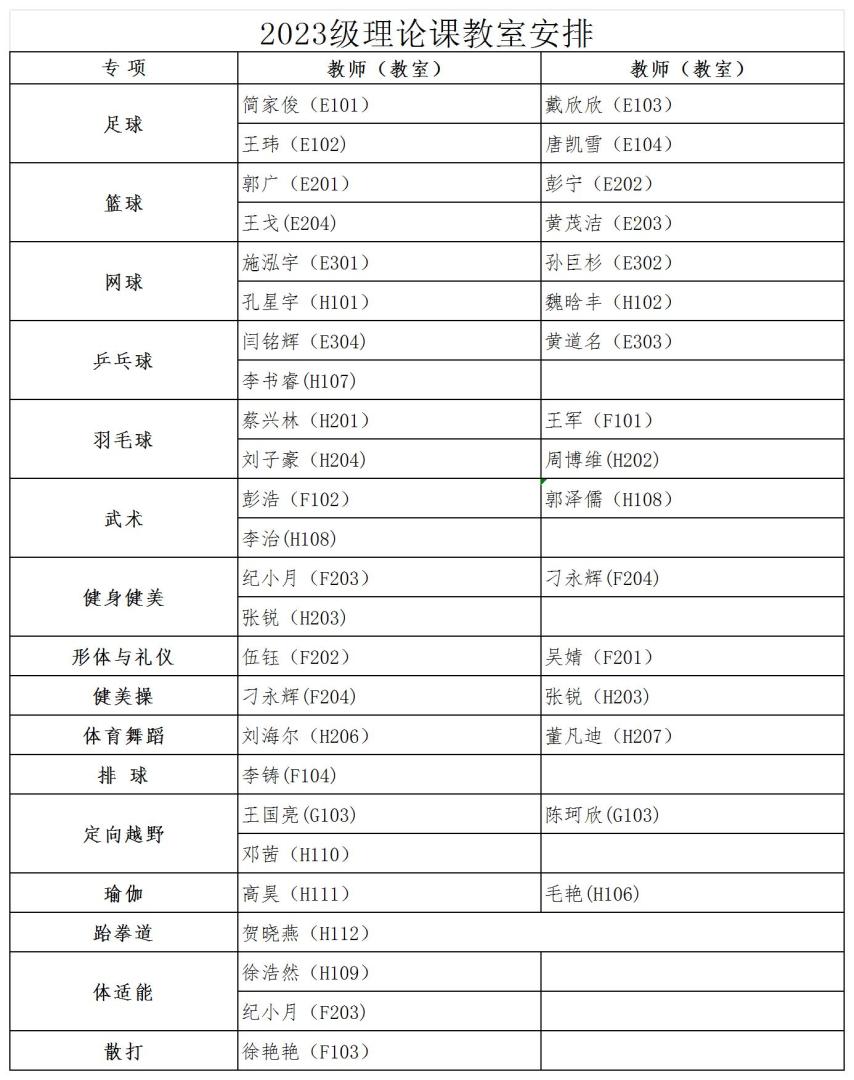 经教务处同意,本学期2023级本科生第3周体育课为多宝(中国)官方理论课,10月7日起恢复户外教学。根据教室资源状况,现将理论课具体安排通知如下: