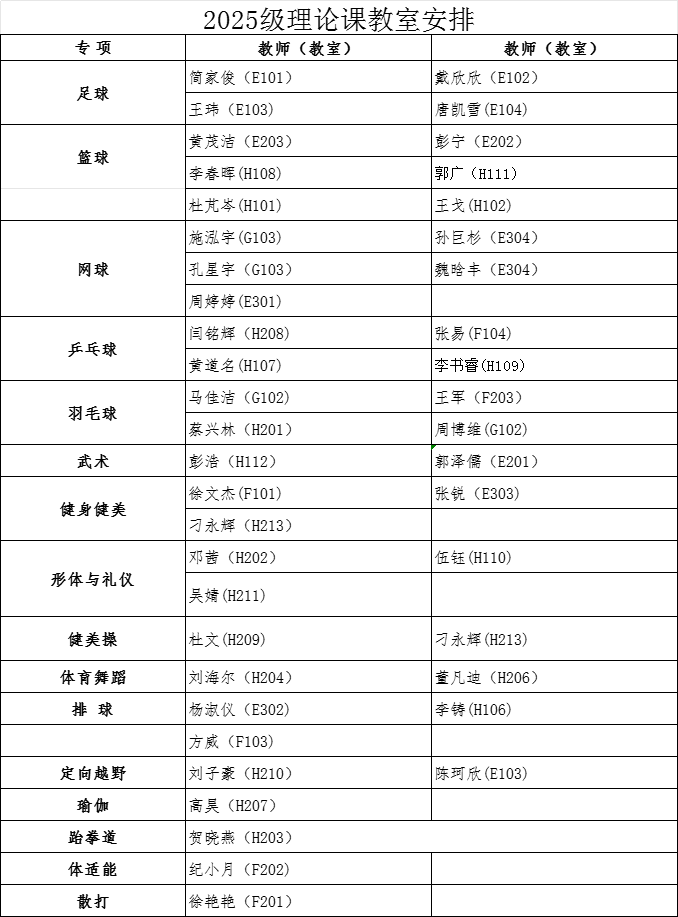 经教务处同意,本学期2025级本科生第3周体育课为多宝(中国)官方理论课,9月28日起恢复户外教学。根据教室资源状况,现将理论课具体安排通知如下: